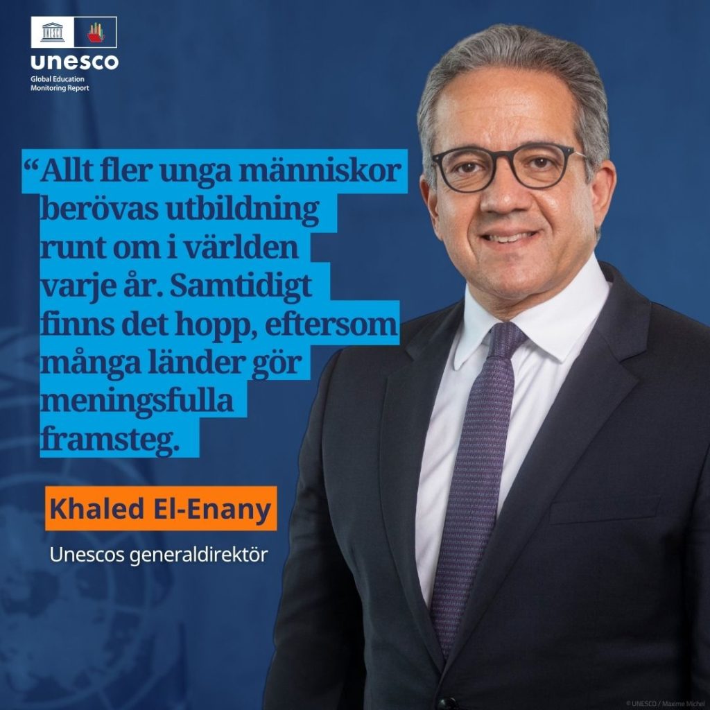 ”Rapporten visar en oroande utveckling där fler och fler unga i världen står utan utbildning varje år. Men det finns också hopp. Sedan år 2000 har fler barn börjat i skolan, och många länder förbättrar sina utbildningssystem. Unesco samarbetar med regeringar och partners för att utveckla möjligheterna till utbildning för alla, på sätt som passar den lokala situationen och som ger varje elev en rättvis chans att bygga sin egen framtid,” säger Khaled El-Enany, Unescos generaldirektör.