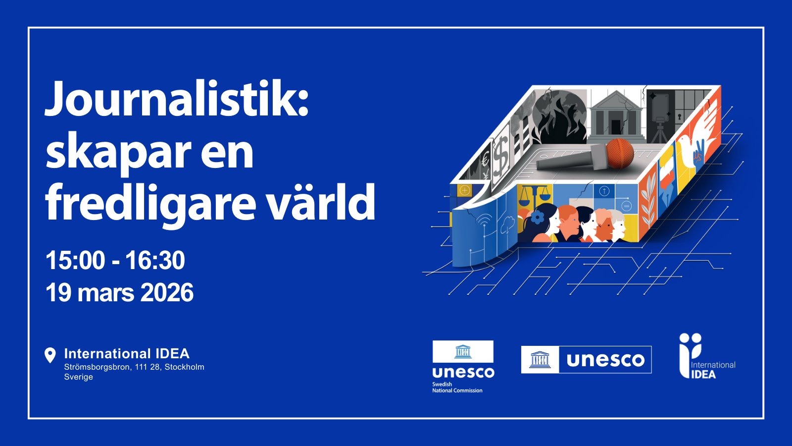 Torsdagen den 19 mars arrangerar Svenska Unescorådet, Unesco och Internationella IDEA en presentation av Unescos rapport ”World Trends on Freedom of Expression and Media Development 2022–2025” med titeln ”Journalistik: skapar en fredligare värld”.